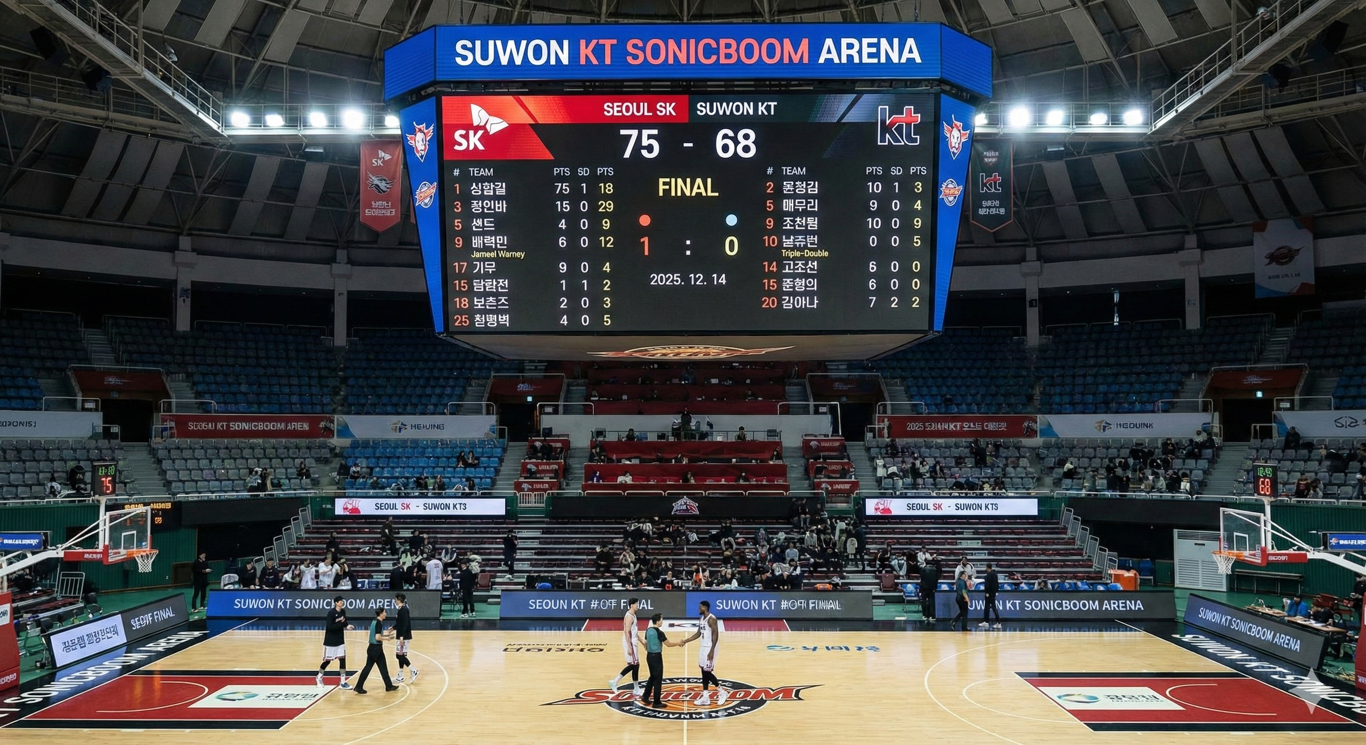 오늘은 2025년 12월 14일(일), 수원 KT 소닉붐 아레나에서 열린 서울 SK 나이츠와 수원 KT 소닉붐의 3라운드 맞대결 결과를 정리해 드립니다.