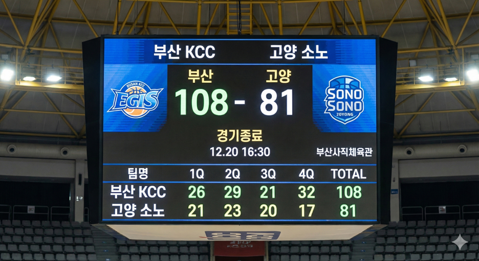 오늘 부산 사직에서 열린 부산 KCC vs 고양 소노 경기는, 흔히 말하는 “한 팀이 경기를 지배했다”라는 표현이 과장이 아닌 경기였습니다. 스코어만 보면 108-81로 끝난 ‘대승’이지만, 실제 흐름은 그보다 더 일방적이었습니다.