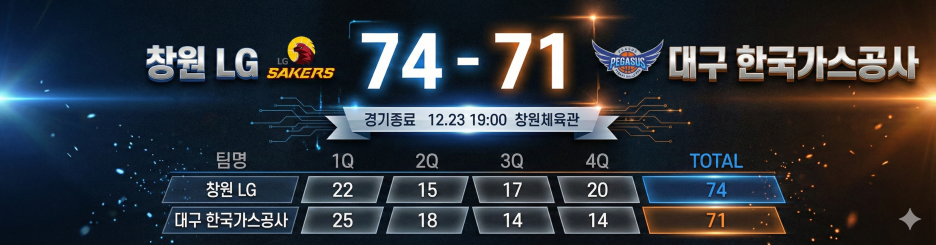 12월 23일 창원체육관에서 열린 창원 LG vs 대구 한국가스공사 경기는, 전반 분위기만 놓고 보면 원정팀이 흐름을 꽉 쥐고 가는 듯했습니다. 한국가스공사가 외곽포로 리드를 만들고, LG는 평소보다 공격이 매끄럽지 않아 쫓아가는 전개가 길어졌죠.